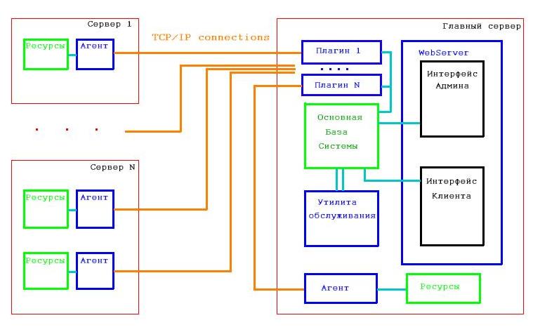 Как видно из рисунка, базовая система установлена на одном сервере. Основной системы является "Основная база" (на рисунке обозначена зеленым квадратом). Эта база является основным хранилищем всех данных, используемых в системе. Все компоненты системы (программы) обмениваются данными только с основной базой. Два интерфейса (Админа и Клиента) являются веб-приложениями, и позволяют отображать и модифицировать данные в базе. Утилита циклического обслуживания запускается периодически и производит различные действия с данными базы. Плагины, снабжающие базу данными статистики так же обмениваются данными только с базой. Помимо этого плагины связываются по протоколу TCP/IP с удаленными агентами, которые, собственно говоря, и являются интерфейсом между системой и конечным сервисом, получая от последнего статистические данные о ресурсах и передавая команды управления. Как видно на рисунке, удаленные агенты могут быть установлены на любых серверах, включая главный сервер (т.е. тот же, на котором установлена и сама система). Такая структура системы имеет один небольшой недостаток, если его можно назвать недостатком. Все данные отображаются в псевдо-реальном режиме времени. Это значит, что обновление информации, выдача команд и сбор статистики происходит через определенные промежутки времени. Например, один раз 2 минуты. Но данный недостаток компенсируется рядом достоинств, таких, как, более высокая надежность данных, за счет простоты структуры и отсутствием постоянной необходимости иметь постоянный доступ к данным. Развитие системы.Система находится в постоянном развитии. К сожалению, создание документации несколько запаздывает от темпов разработок. Но мы стараемся компенсировать этот недостаток on-line поддержкой, чем и является данный сайт. Развитие системы происходит в нескольких направлениях. Во первых, расширяется спектр формализмов, включаемых в основной модуль и позволяющих расширить область применения и сделать более настраиваемую и гибкую структуру описания услуг. Отдельное направление развития системы касается связки "плагин - удаленный агент". По сути, возможности и совместимость удаленного агента определяет совместимость системы с различного рода услугами. Он является своеобразным интерфейсом между системой и конкретным аппаратно-программным ядром сервиса. В настоящее время постоянно ведется работа по усовершенствованию плагинов и протоколов обмена. |